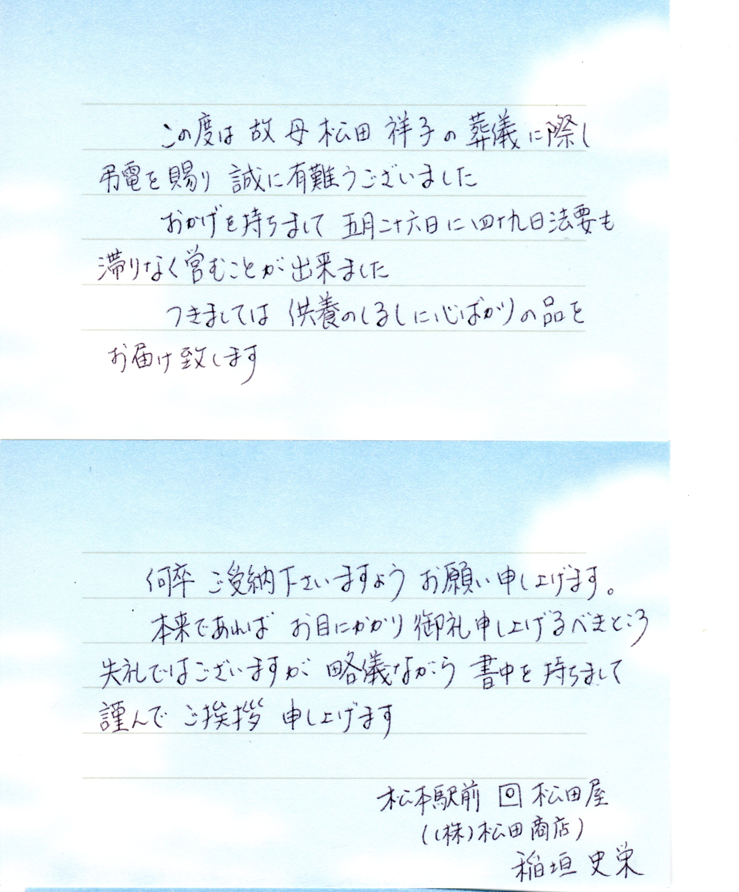4月16日東京、代々木幡ヶ谷斎場で執り行われた信州松本駅前・松田屋商店の店主・松田祥子様の葬儀の際にKGACから送られた弔電に対する返礼の意味を込めたものでしょう。 喪主の稲垣史栄さまがKGACや田中外治OBから供花と共に弔文の弔電が届いており「亡くなった母も喜んでいるでしょう」と参列の皆様にご披露された。