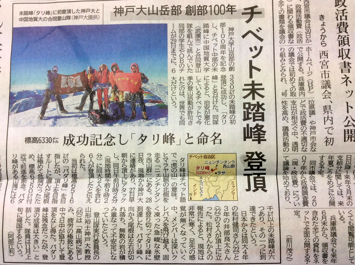 すでにご存じかも知れませんが、先週の神戸新聞に、神大山岳部創部100周年を記念のチベット遠征でチベットの未踏峰登頂成功の報が掲載されました。 関学山岳部創部100週年でもやりたいですね!