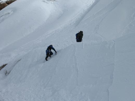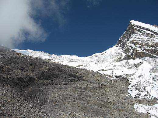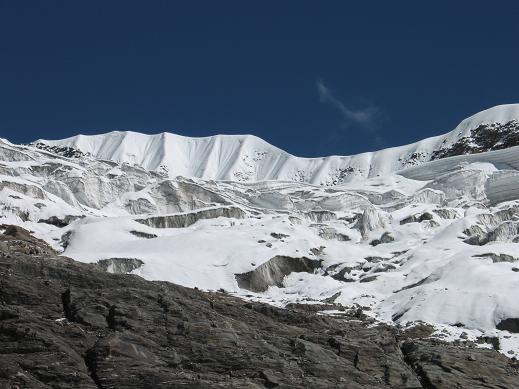 Camp(MBC,3,700m)経由 8日目、高所順応と休養・・・・シェルパはルート偵察とルート工作 9日目、午前2時40分、ヘッドライトを点けて出発、4時半、ラクシ・ピーク直下着。アイゼンを着用して氷河を渡る、途中で夜が白んできた。Tharpu Chuliの肩から連なる稜線への蒼氷の壁は傾斜が50度とも60度とも言われているが急斜面ながらシェルパの設置したフィックス・ロープをユマールとバイルを使い1ピッチが50m、4ピッチ。丁度200mだった。この青氷に取りついた直後、左足首に激痛が走った。足裏を全面フラットに斜面に置いても、内アイゼンの歯だけ突いて立とうとしても激痛が走った。試行錯誤の後、幸い足首を曲げずに伸ばし、前爪の2本だけを蒼氷の斜面に蹴りこめば何とか登ることが出来た。こんな状態で冷汗ものながら稜線に出た。左足は前ツァッケ2本だけで200m程登りきったのだ。Tharpu Chuli頂上(5,663m)まで残りは100m程だ。未だ、朝の7時15分だ! 10日目、ACから5時間半かけてMBC着、ロッジ泊。・・・下山途中、ガレ場の数箇所でシェルパにビレーしてもらい安全を期して下った。 11日目、MBCから9時間歩きに歩いてSinuwa(2,340m)着、ロッジ泊。 12日目、ドンドン歩くこと11時間40分でSyaule Bazar到着、ロッジ泊。 13日目、2時間半で振り出しのNayapoolに帰着、車でPokharaに出てロッジ泊。 予定をかなり短縮した行程になった理由: 1.高所の影響を受けなかった。猛暑の中、毎日の訓練歩行、恒例の富士山宿泊登山の実施と出発3〜4日前に「三浦BC」で夕方から3時間低酸素室でペダル漕ぎやトレッドミルでの歩行、引き続き夜は低酸素室(5,000m相当に調整)での睡眠、翌朝3時間のトレッドミルでの歩行といった高所順応訓練も役立ったことだろう。 3.登りも下りも、ゆっくりながら歩き出したら昼食以外は休憩を取らずに 歩き続けた。 反省点: 2.そんな事で登山予備日の1週間を含め、2週間を下山後ポカラやカトマンズ過ごすことになった。 ポカラで5日泊、カトマンズで7日泊、時間はあるが下山した後はトレッキングにさえ出かける気にならず、毎日のように下山してくる登山隊隊員たちと情報交換したり、本屋に通った。 お蔭様で来年用の魅力有るピークを見つけた。