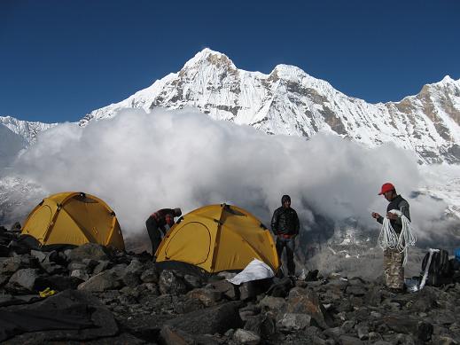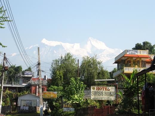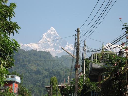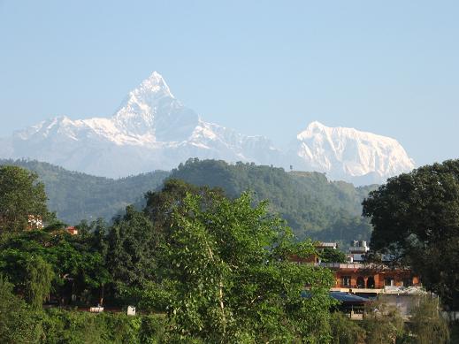 カトマンズに入った翌日早朝にポカラ(820m)に飛んだ。大雨の為、道路が寸断されており、前日早朝に小型バスで出発し先回りしていたシェルパたちとポカラ空港で合流、車で2時間、登山出発点になるナイプール(1,000m弱)着。 2日目も終日大雨、8時間半歩いてChhomorong(2,170m)到着、6室建てのロッジ泊 3日目、曇り時々晴、7時間半歩いてDovan(2,505m)着、6室建てのロッジ泊 アンナプルナの山々が首が痛くなるほど上に見え始めた。凄い迫力だ。 4日目、晴れのち大雨、3時間半でDeurali(3,239m)着、ロッジに入った後大雨と雷鳴。 5日目、晴後濃霧、夕方から大雨。 4時間半でMachhapuchhre Base