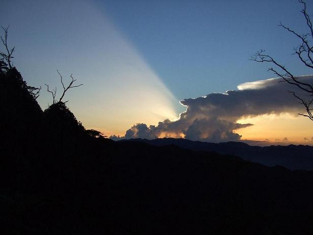 大荒れの昨夜とはうって変わり深仙は静かである。やがて明るくなり遠く東方に鉄槌状の巨大積乱雲がありその中心部には1〜2秒間隔で稲妻が走る。雷鳴は届かない。やがてその左より光線が天を射る。荘厳な光景だ。