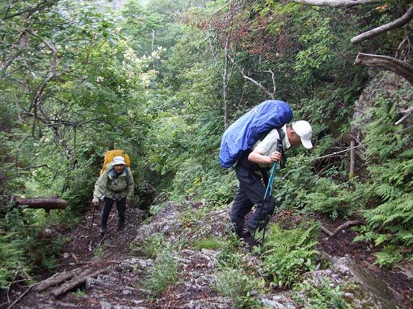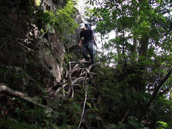 昨日の出発時に山上ケ岳から弥山を見たときとは違い今日は前鬼・小仲坊の五鬼助住職に会える楽しみがある。"舟のタワ"で昨日、東京から来た単独行者に再び追い抜かれる。彼に「前鬼に着いたら年寄り3人組が後から来ると伝えて下さい」と伝言を託す。明星ケ岳は西側の樹林帯斜面をトラバースしアップダウンをくりかえす。稜線から高度感のある大きなガレの頭を3〜4b下りさらに山腹のトラバース道を進む。森林帯の中では風はなく湿度が上がり時折日光が直射する。"鳥の水"に至り水を求めようと辺りを探るが道の窪みにかすかに小さな水たまりを認めるだけで給水できるものではない。次の水場・深仙の宿の香精水まで致し方なく節水を決める。休憩は極力鞍部の風の通り抜ける日陰を選ぼうとするが適当なところは少ない。少しの水を口に含み喉を潤しながらの前進となる。弥山で補充してきた水の残量は次第に少なくなってくる。日頃耐暑対策をしていない我々にとっては厳しい前進となる。昼食をとり元気が回復し仏生ケ岳西側の肩を通過するとギャップとなり"橡(えん)の鼻"である。