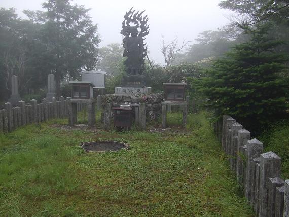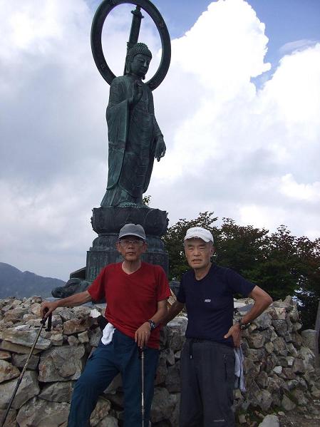 樹林帯を下りミヤコザサより背丈のあるササ原に不明瞭なルートに導かれ左側に回りこみ岩壁基部へと進み腹式呼吸を繰り返し急登する。小さなギャップを一旦下り再び急なルートを木の枝を頼り岩かどをつかみながら登る。ストックが邪魔でうっとうしい。北西の上空には雄大な積乱雲が輝き上部は平坦になりつつあり南西からは黒い雲が低く進んでくる。釈迦ケ岳から前鬼まで約3時間を要す!先を急ごうと思うが身体はついてこない。釈迦ケ岳は始めての矢崎氏に先行を促し頂上を踏んでもらう。「フー」と深呼吸し握手。巨大な釈迦如来像を仰ぎ合掌する。
