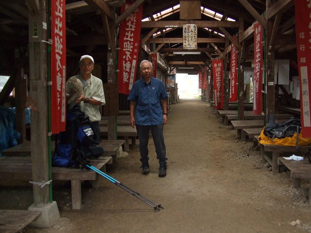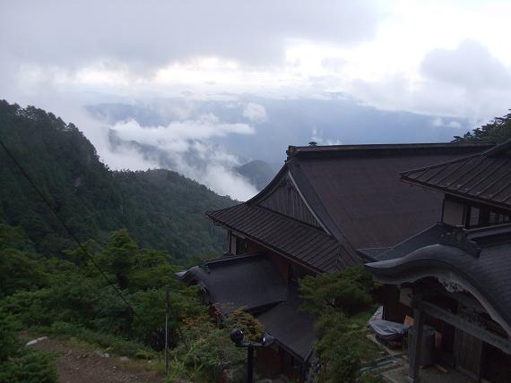 の裏(北側)にもルートの痕跡があるがより鮮明な左の道を選択して標高差300b程の登りにかかる。"聖宝八丁"といわれる最後の急登である。木製の階段には脚力がすっかり低下してしまい次のステップにはストックを低く持ち替え気合を入れ腕力で身体を押し上げないと次の段のステップに移れない。2度後続者の頭でザックを押される。小屋への到着時間は尚30分ほど遅れるペースになる。 額から汗が流れるように滴りステップの木板に落ちる。「小屋だ!」と聞き見上げるがガスと眼鏡のくもりで判然としない。左にジグし右に切り返すとぼんやりと建物が現れる。出入口の手前の窓から小屋番が玄関に回り「このルートで12時間もかかるとは!普通の人は10時間で駈ける!」と到着早々に一喝を見舞われる。追い討ちをかけて「山岳マラソンでは吉野から天川へ5時間だ!」と打ちのめされる。「山岳マラソン?!そんなものに興味は無い!」と反駁する。泊り客は7〜8人で同室は若夫婦と我々3人である。ザックを廊下で整理し急いで夕食をすませ明朝の弁当を受け取る。消灯時間は21時までであるが小屋番の威圧に恐れをなしてか誰一人として暗い雰囲気である。昨夜神崎師から告げられた天気予報は幸いにはずれ雨にあうこともなく歩けたことはありがたい。毛布が厚く寝苦しい。