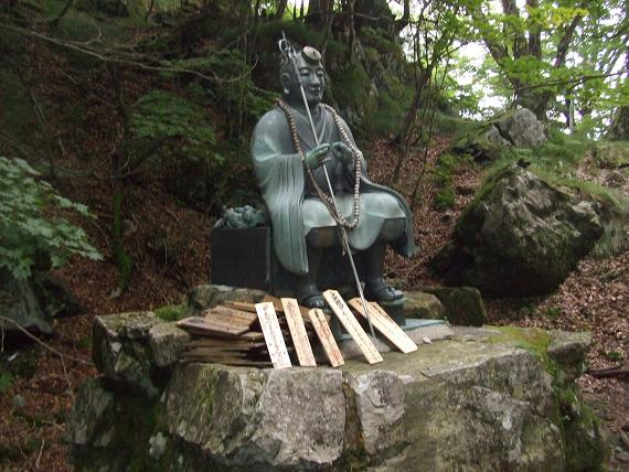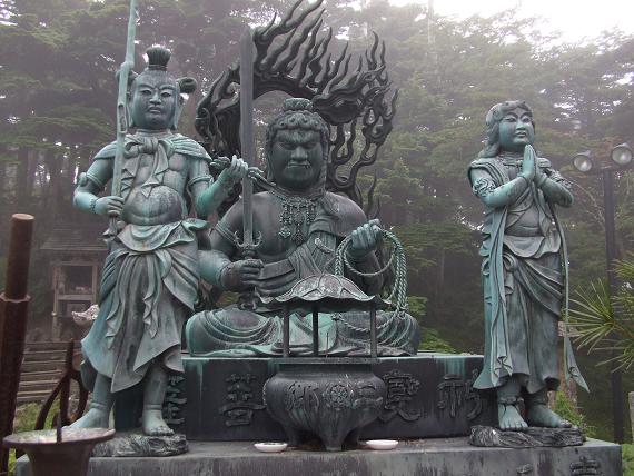 やがて霧雨にけむる青銅の"出迎不動尊"の横にでる。