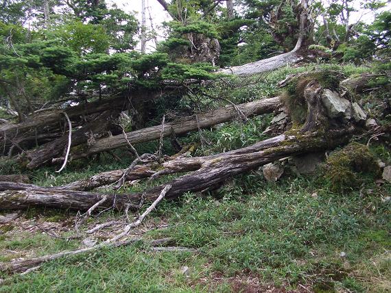 アップダウンや平坦な歩きやすい道を南へ進む。ところどころモミの大木が根こそぎ倒れ無残な様相を呈している。