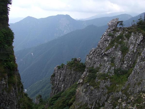 懸念していた膝痛と筋肉痛は感じない。弥山小屋到着リミットは17時だが30分ほど遅れると予約段階で了解を取り付けていたが、再度連絡すべく携帯電話を見ると圏外表示。ムーバとau以外は不通であると云われる。弥山までの行程で山上ケ岳から奥駈け道の下降地点と大普賢岳の登り、弥山への最後の登りルートを訊ねると詳しく教えていただき善蔵院を辞す。"大峯山寺"の南端、見晴らしの良い下降点よりこれから縦走する峰々を眺めると足元から連なる峰々の先は遥かかなたに弥山が確認できるが途方もなく遠くに感じる。気を取り直し「前進到達」を唱え前進する。地図案内に特異な名称で記された難所らしく思える箇所(薩摩ころげ・内侍落しなど)は通過に戸惑うようなところではない。