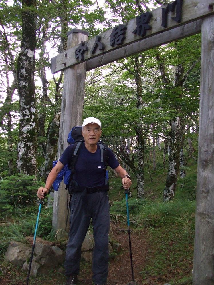 女人結界門をくぐり左の新ルートに入ると原生林におおわれた緑の回廊が続き樹木から発する精気を身体に受け爽快だ。修験道の根本道場として過去多くの行者さんや修験道の信者たちに踏みしめられた道である。再び旧道と合流し前方にぼんやりとさびた大鍋がつるされた堂宇に着く。朽ちた倒木に腰掛けて昼食をとる。薄い霧が流れやがて雨が降りだし雨具を着装する。稜線にでると東側から微風がそよぎ嬉しい。